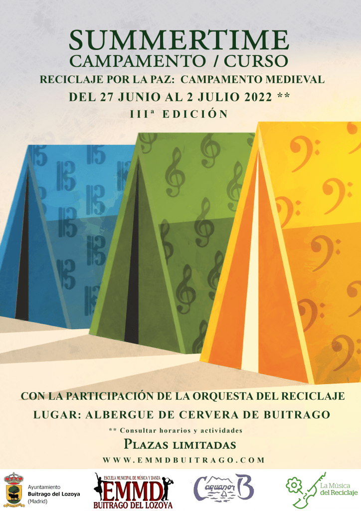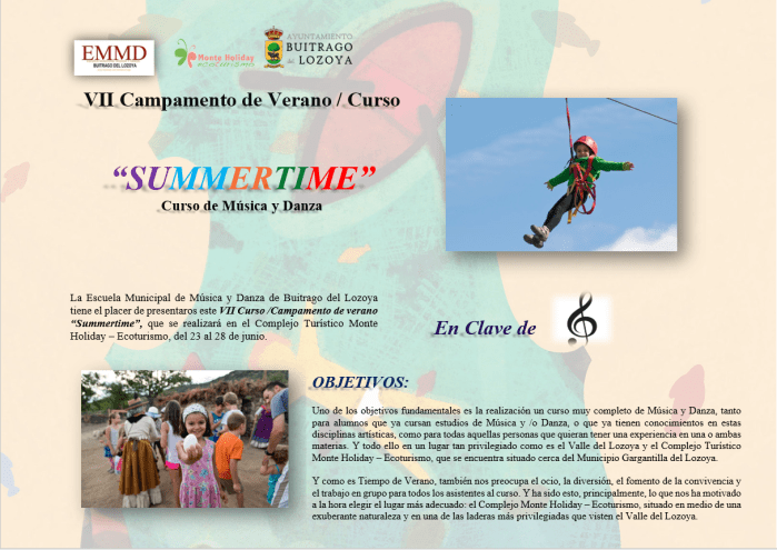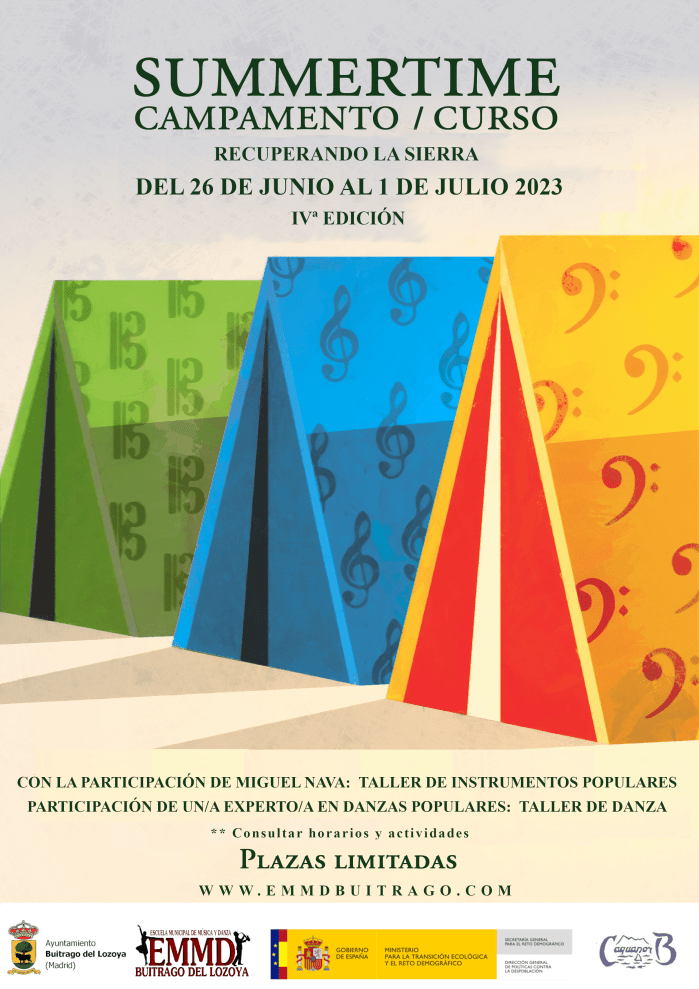 La Escuela Municipal de Música y Danza de Buitrago del Lozoya, junto con su Ayuntamiento, os propone esta nueva edición del “Summertime”, que tendrá lugar entre los días 26 de junio al 1 de julio de 2023 en el albergue CB Acquanor de Cervera de Buitrago.